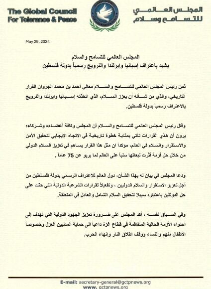 ثمن رئيس المجلس العالمي للتسامح والسلام معالي أحمد بن محمد الجروان القرار التاريخي، والذي من شأنه أن يعزز السلام، الذي اتخذته إسبانيا وايرلندا والنرويج بالاعتراف رسمياً بدولة فلسطين.