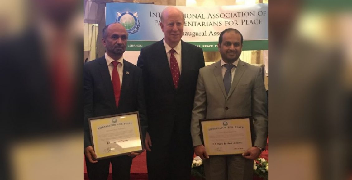 منح رئيس الاتحاد العالمي للسلام (UPF) السيد توماس والش كلاً من سفير دولة الامارات العربية المتحدة في لبنان الدكتور حمد سعيد الشامسي ورئيس المجلس العالمي للتسامح والسلام معالي السيد احمد بن محمد الجروان شهادة سفير للسلام تقديراً لجهودهما المميزة في مجال التسامح والسلام على الصعيد الدولي، وذلك خلال مؤتمر انعقد في فندق فينيسيا في بيروت امس في حضور حشد من الدبلوماسيين والاكاديميين والناشطين في حقل السلام.