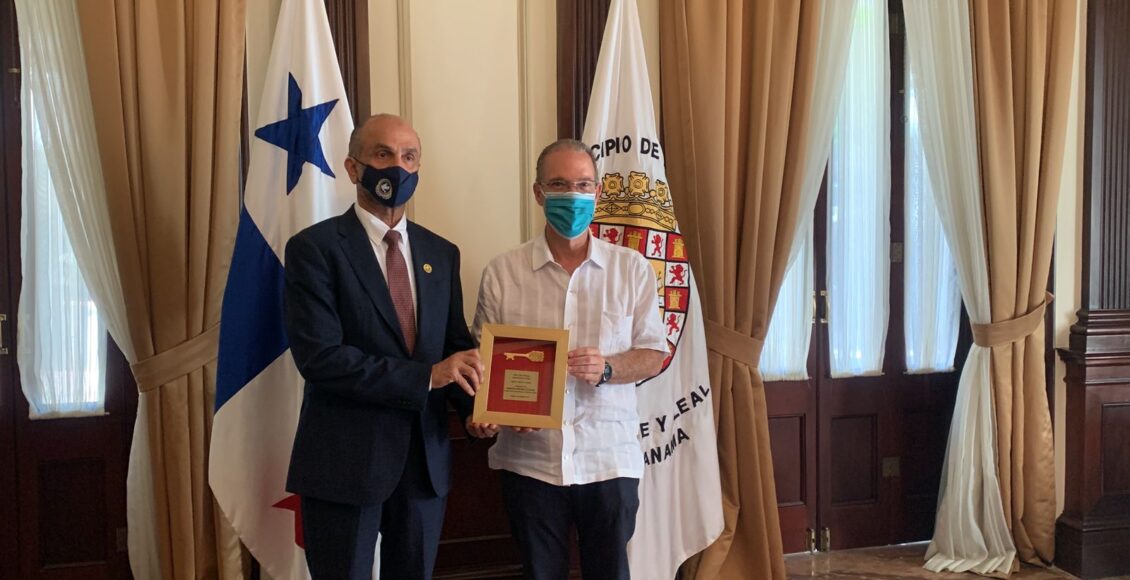 قدم سعادة السيد خوسي لويس فابريجاس عمدة مدينة بنما سيتي البنمية مفتاح مدينة بنما سيتي لمعالي أحمد بن محمد الجروان رئيس المجلس العالمي للتسامح والسلام، جاء ذلك خلال زيارة وفد المجلس العالمي للتسامح والسلام لبنما بهدف بحث سبل تعزيز التعاون في مجالات التسامح والسلام.