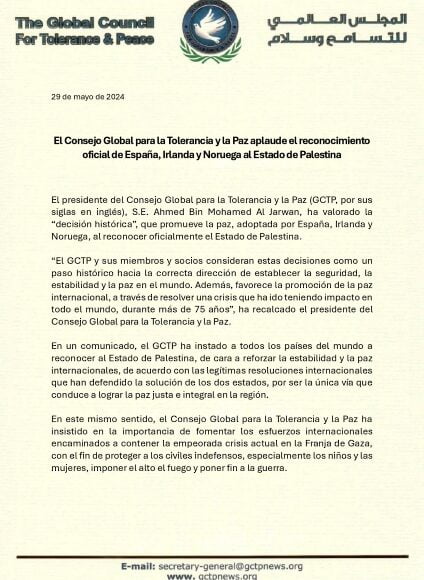 El presidente del Consejo Global para la Tolerancia y la Paz (GCTP, por sus siglas en inglés), S.E. Ahmed Bin Mohamed Al Jarwan, ha valorado la “decisión histórica”, que promueve la paz, adoptada por España, Irlanda y Noruega, al reconocer oficialmente el Estado de Palestina.