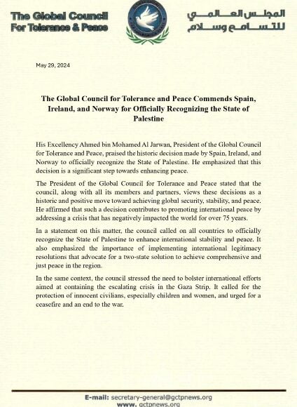 The Global Council for Tolerance and Peace Commends Spain, Ireland, and Norway for Officially Recognizing the State of Palestine