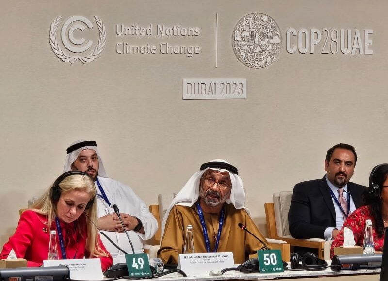 Amidst the proceedings of the ninth day of the COP28 Conference of the Parties, hosted by the United Arab Emirates, His Excellency Ahmed bin Mohamed Al Jarwan, President of the Global Council for Tolerance and Peace, delivered the opening speech at the Conference on Promoting Multilateral Action: Youth, Peace, and Climate Security, held under the auspices of the United Nations and the United Nations Fund for Population Activities (UNFPA).